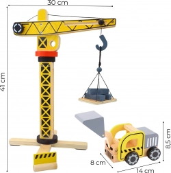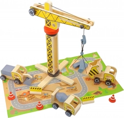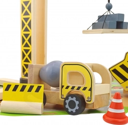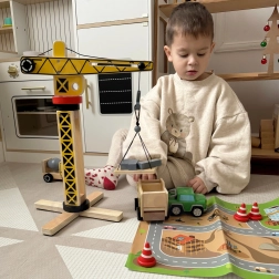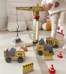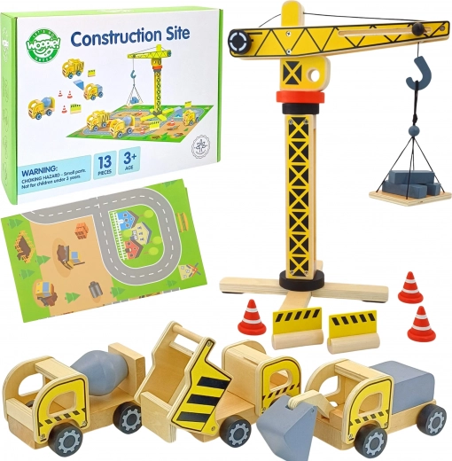 L'ensemble de construction avancé de la marque WOOPIE GREEN est conçu pour les petits bâtisseurs. Cet ensemble contient une grande grue en bois, trois véhicules de construction et d'autres accessoires pour des jeux de construction réalistes.