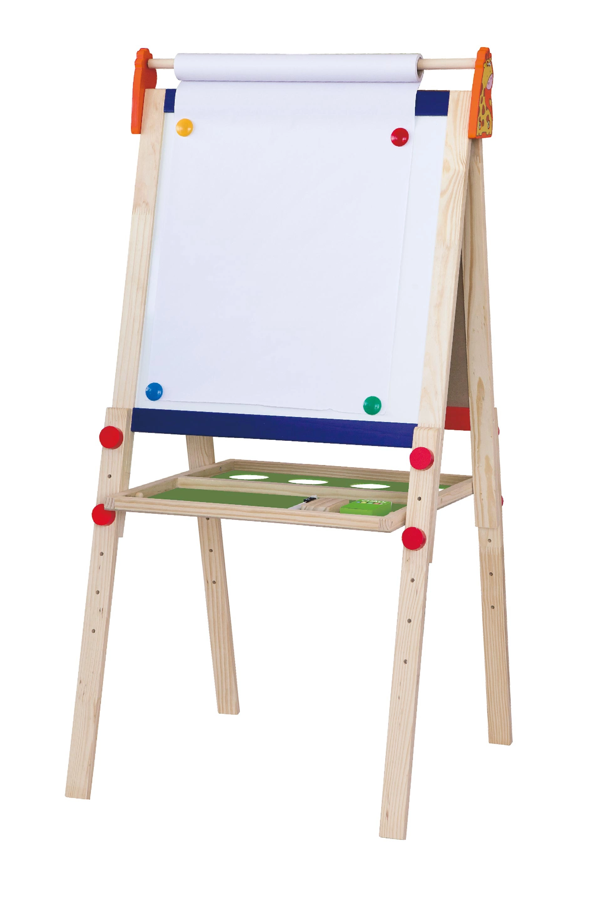 Il comprend également un rouleau de papier placé en haut et des aimants pour fixer les feuilles, permettant aux enfants de passer facilement de la peinture sur papier à l’écriture au feutre ou au dessin à la craie. Tout le nécessaire est inclus – il suffit de déballer et de créer.