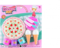 Ensemble coloré pour découper le gâteau, idéal pour les enfants à partir de 3 ans. L'ensemble comprend un gâteau maintenu ensemble par un velcro et inclut également des couteaux et accessoires comme une assiette et des tasses.