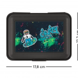 Nous vous proposons un lunchbox en plastique unique au design moderne et affirmé. Ce modèle noir au style graffiti est idéal pour une utilisation quotidienne à l’école ou au travail. Son couvercle graphiquement attractif séduira surtout les amateurs de skateboard et de mode de vie actif.