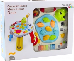 - Petit piano avec sons d’animaux ; jeu d’adresse avec marteau ; effets sonores et lumineux ; tête de crocodile interactive