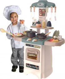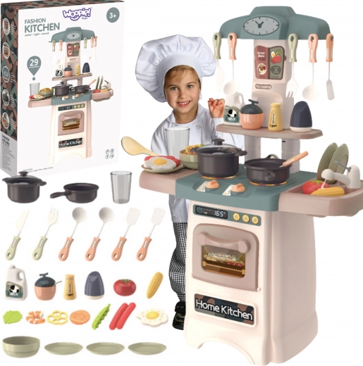 Cette cuisine WOOPIE moderne offre aux enfants une expérience de cuisine réaliste. Grâce aux brûleurs lumineux et sonores, cuisiner devient un jeu amusant, tandis que le robinet fonctionnel avec eau réelle permet de laver la vaisselle comme dans une vraie cuisine. On y trouve aussi un four ouvrant avec écran et boutons, une horloge classique, un évier avec égouttoir à assiettes, ainsi que des étagères et crochets pour les accessoires.