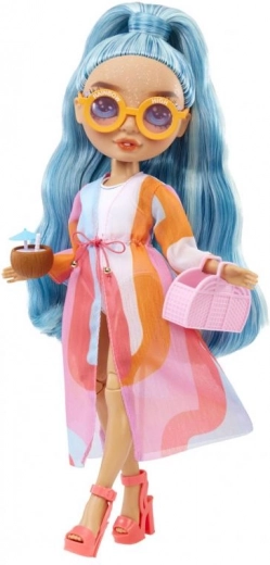 Des lunettes de soleil orange avec le logo RAINBOW HIGH, un sac rose et une boisson coco apportent une touche amusante et photogénique à la tenue.