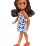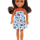 La poupée se distingue par une robe bleue à imprimé arcs-en-ciel, cœurs et gourmandises, de longs cheveux bruns avec un serre-tête rose et des sandales rouges. Elle peut être combinée avec d’autres poupées Chelsea et des accessoires (vendus séparément) pour un amusement encore plus riche.