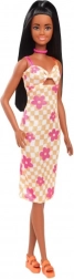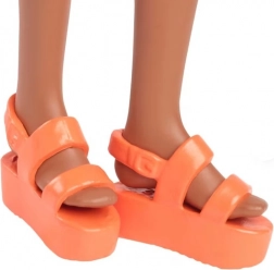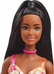 La superbe grande poupée Barbie avec de longs cheveux noirs partiellement attachés, agrémentée d'un collier ras du cou rose et de sandales plateformes orange. Son look est complété par une robe élégante avec un motif floral.