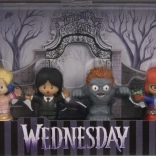 Les figurines du set représentent les personnages de Wednesday Addams avec La Chose, Enid Sinclair, Marilyn Thornhill avec une dahlia noire et le monstre Hyde.