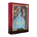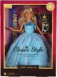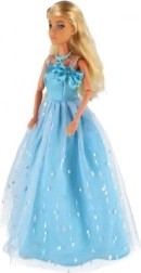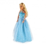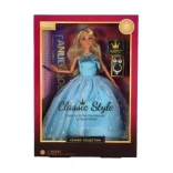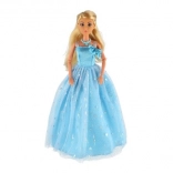 La poupée porte une longue robe bleue au motif délicat et aux détails scintillants qui séduisent au premier regard.