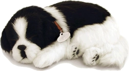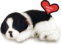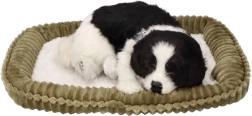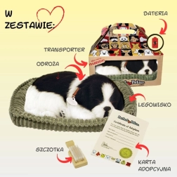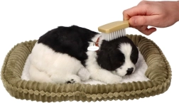 Un pelage noir et blanc détaillé, un collier avec médaille et une douce « respiration » pendant le sommeil confèrent au chiot l’authenticité d’un vrai petit compagnon.