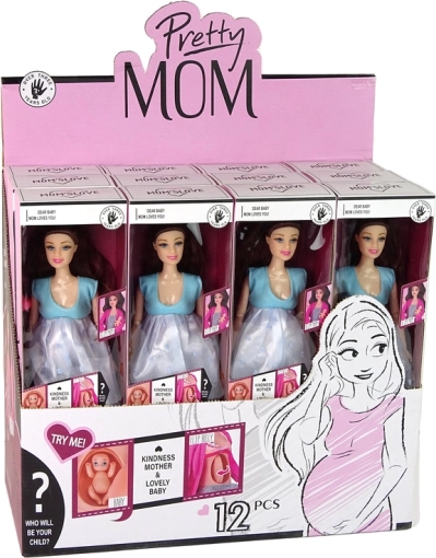 Adorable poupée enceinte avec ventre ouvrant et mini bébé, parfaite pour le jeu créatif. Elle a de longs cheveux bruns, porte une élégante robe bleue à pois et des membres articulés pour des poses... Voir plus