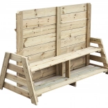 De l’autre côté du panneau, un banc confortable pour se reposer et une étagère inférieure pour ranger seaux, pelles et autres accessoires.