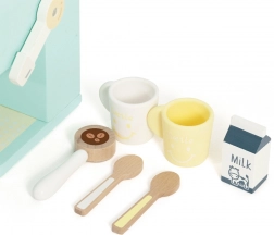 Le set contient tout ce dont les enfants ont besoin pour servir du « café » : la machine, 2 tasses, 2 cuillères, une boîte de « lait » et un pilon/mesure pour le café. Le jeu stimule la motricité fine, la coordination œil–main ainsi que l’interaction sociale.