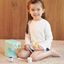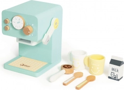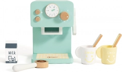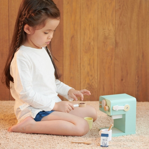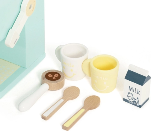 Offrez aux petits baristas une expérience authentique de préparation du café. Cette machine à café en bois au design turquoise paraît réaliste grâce au levier et au bouton rotatif avec bruit mécanique. La fabrication soignée sans arêtes vives et le bois naturel de qualité garantissent durabilité et sécurité.