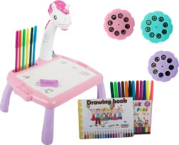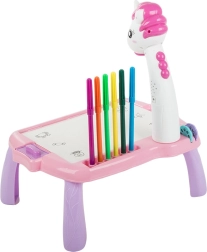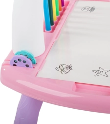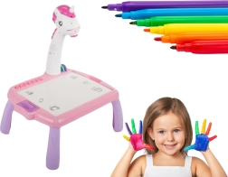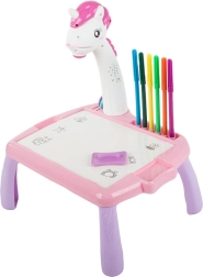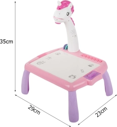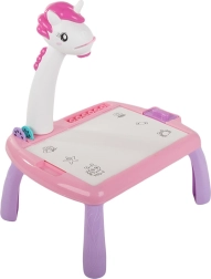 Stimulez la créativité des enfants avec cette table à dessin rose dotée d’un projecteur en forme de licorne. Grâce à la projection de modèles, les enfants reproduisent facilement des images, écoutent de joyeuses mélodies et développent leur motricité fine, leur imagination et leur concentration. Sa structure stable, ses compartiments pour feutres et disques et jusqu’à 24 modèles en font un excellent cadeau pour les petits artistes.