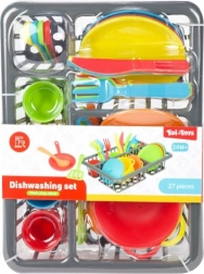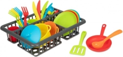 Ludique set de cuisine pour petits chefs comprenant 27 pièces – casserole, poêle, assiettes, tasses, couverts et autres accessoires. Favorise la créativité, la motricité fine et les compétences sociales lors des jeux de cuisine et de service. Un blister pratique garde le tout bien organisé. Convient aux enfants à partir de 2 ans.