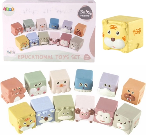Ce set de 12 cubes souples est conçu pour un jeu sûr et stimulant pour les tout-petits. Chaque cube représente un animal différent et offre une texture de surface distincte, procurant de riches stimuli tactiles. Les enfants développent naturellement la coordination œil–main, apprennent à reconnaître les formes, les couleurs et les noms des animaux tout en exerçant leur préhension.