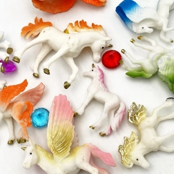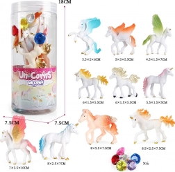• 16 pièces dans le coffret : 10 licornes + 6 “gemmes”