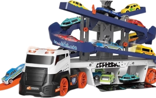 Des volets latéraux ouvrants et une remorque spacieuse assurent un chargement facile et un transport réaliste des petites voitures.