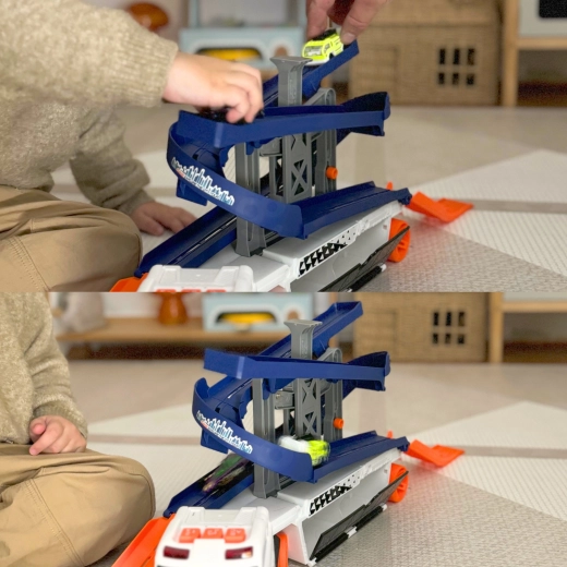 Une piste multi-niveaux avec rampe permettant le stationnement, des descentes rapides et des sauts. Parfait pour développer la motricité et l’esprit de compétition.