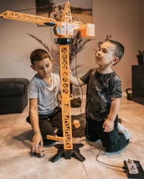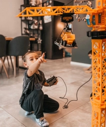 La grue tourne entièrement et permet de soulever, d’abaisser et de déplacer les charges le long de la flèche – comme sur un vrai chantier. Amusement garanti et entraînement de la coordination.