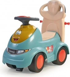 Le volant avec lumières et sons stimule les sens et le jeu d’imitation, tandis que les roulettes pivotantes à 360° sous les repose‑pieds facilitent les manœuvres. Le compartiment sous la selle accueille petits objets et jouets pour tout avoir sous la main.