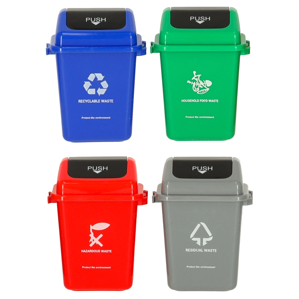 Quatre poubelles en plastique résistant avec des symboles et des couleurs clairs pour une orientation facile. Elles peuvent être reliées en une seule rangée.