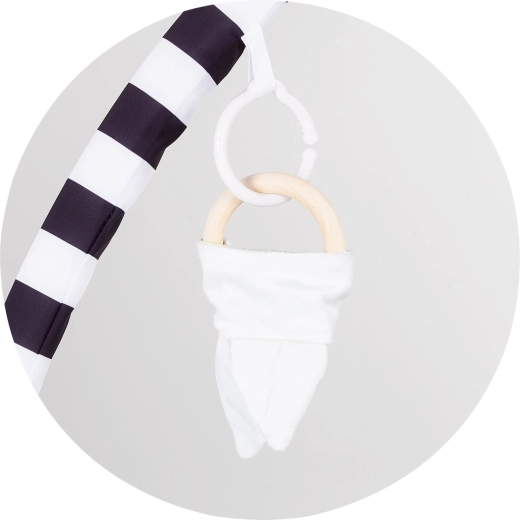 Deux arches portent cinq jouets variés, détachables, interchangeables et lavables. Ils favorisent la coordination, le toucher et l’attention visuelle.
