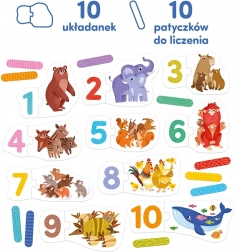 Jouer avec les puzzles favorise le développement du vocabulaire, la fantaisie et la perception visuelle. Les enfants peuvent nommer les animaux, inventer des histoires et chercher des chiffres dans leur environnement. Le set constitue un excellent départ pour apprendre à compter jusqu’à 10 et les premières tentatives d’écriture des chiffres.