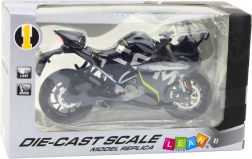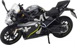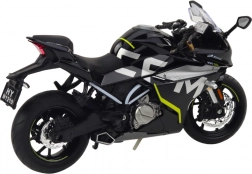 Ce modèle sportif de moto, dans une élégante couleur noire, reproduit fidèlement une véritable machine de course. Grâce aux pièces métalliques et aux détails soigneusement exécutés, il est idéal comme décoration sur une étagère comme en jouet robuste pour un usage quotidien. Les lumières et sons intégrés renforcent encore le réalisme.