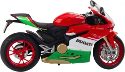 Modèle en métal au design tricolore (rouge, blanc, vert) inspiré des motos de course italiennes, se distinguant par son authenticité.