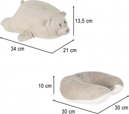 Ce pratique coussin de voyage 2-en-1 est idéal pour les enfants comme pour les adultes en quête de confort pendant les déplacements. Le coussin se transforme facilement en ourson en peluche, parfait pour les câlins. Il offre un excellent soutien pour le cou et la tête grâce à sa forme ergonomique et à son remplissage léger en billes de polystyrène.