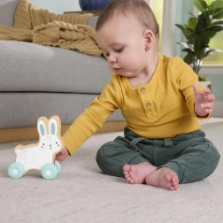 Ce ravissant lapin à roulettes invite les tout-petits au jeu actif – des premiers touchers et poussées en position assise jusqu’au rampement et à la poursuite du jouet sur le sol. Sa forme compacte convient aux petites mains et le roulement fluide favorise la coordination des mouvements et la curiosité naturelle.