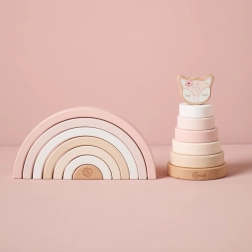 Ce minimaliste arc-en-ciel en bois deviendra un jouet préféré et un accessoire design pour la chambre d’enfant. Les enfants peuvent empiler les arcs, trier, construire des ponts et des tunnels ou les utiliser comme petites maisons et enclos pour figurines. Les formes simples stimulent l’imagination et le jeu autonome.