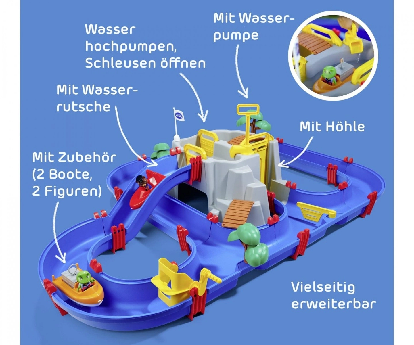 Profitez du plaisir avec le circuit aquatique AquaPlay Lac de montagne. Cet ensemble unique comprend 69 pièces, dont 2 bateaux et 3 figurines, une grande grotte et une cascade.