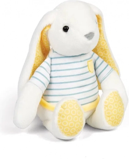 Adorable et douce peluche lapin aux longues oreilles, t-shirt rayé bleu et pieds à motif jaune, idéale pour jouer comme pour dormir. Fabriquée à partir de matériaux recyclés certifiés GRS, conforme aux normes de sécurité européennes et adaptée dès la naissance.