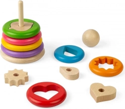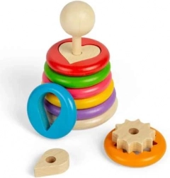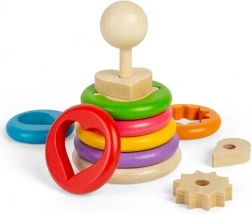 Ce jouet d’empilage original propose sept anneaux en bois, chacun renfermant une forme différente – par exemple un cœur, une étoile, une feuille ou une roue dentée. Les enfants associent d’abord la bonne forme à l’anneau, puis enfilent l’ensemble sur la tige en bois. Une manière ludique de comprendre les formes, tailles et perceptions spatiales.