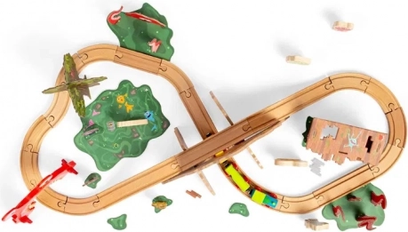 Toutes les pièces sont en bois certifié FSC de qualité, avec peintures et vernis non toxiques. Le set est compatible avec la plupart des systèmes ferroviaires en bois, ce qui permet d’agrandir facilement vos rails et accessoires existants.