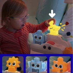 Le mode soir propose des berceuses apaisantes, des effets lumineux tamisés et un projecteur d’étoiles pour un endormissement serein. Le mode matin illumine la journée avec des chansons optimistes, des sons de la nature et des motifs lumineux frais. Grâce à une commande simple et à des briques robustes, le set est idéal pour les tout-petits.