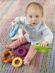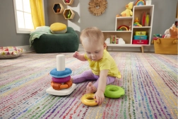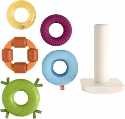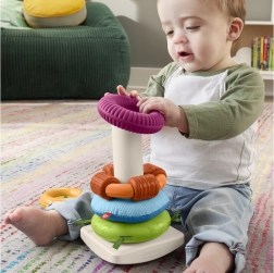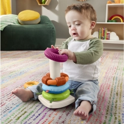La pyramide sensorielle à empiler Fisher-Price est une version moderne du jouet classique, avec une base basculante et cinq anneaux de tailles différentes. Chaque anneau offre une expérience tactile unique – des matières souples aux structures marquées, en passant par des perles qui font du bruit. Les enfants développent leur dextérité par le jeu naturel : ils saisissent, secouent, trient et empilent.