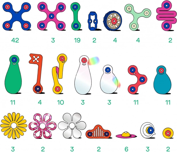 - 150 pièces en 11 couleurs incluant des roues, des éléments scintillants et prismatiques
