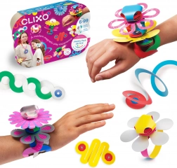 CLIXO Jewelry est un set thématique scintillant inspiré de l’origami qui utilise de puissants aimants pour relier différentes formes et créer des bijoux et accessoires originaux. Les longues bandes et les éléments floraux spécialement conçus permettent de former des spirales, des pendeloques et des ornements capillaires marquants. Les pièces sont résistantes à l’eau, légères et sûres – sans BPA ni phtalates.