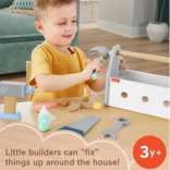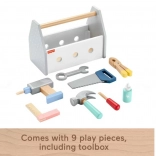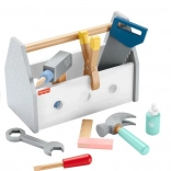 Ce set d’outils en bois est conçu pour permettre aux jeunes enfants d’imiter le monde des adultes à travers un jeu sûr et créatif. L’ensemble comprend des outils comme une perceuse jouet, un marteau, un tournevis, une clé, une scie, une pince, une règle et de la colle, ainsi qu’une armoire spacieuse pour ranger tous ces outils.