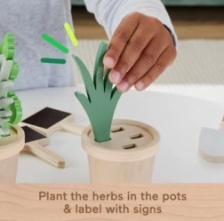 Les enfants peuvent faire pousser des herbes dans les pots, les étiqueter à l’aide des ardoises fournies (craie non incluse) et utiliser le pulvérisateur pour prendre soin de leur petit jardin.