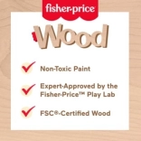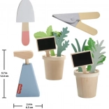 Le set de jardin en bois pour enfants comprend 12 pièces, dont : 2 pots avec des feuilles et plantes en bois, une cuillère de jeu, des ciseaux de jeu, un flacon pulvérisateur et 2 ardoises pour nommer les plantes. Le produit est fabriqué en bois certifié Forest Stewardship Council (FSC-N004566) et décoré avec des peintures à base d’eau non toxiques.