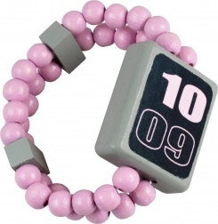 Perles en bois roses sur élastique, faciles à enfiler et tenant bien au poignet des enfants.