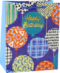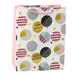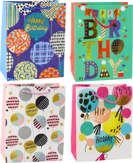 Différents motifs avec ballons, étoiles et inscriptions « Happy Birthday » donnent une ambiance festive au cadeau et attirent l’attention.