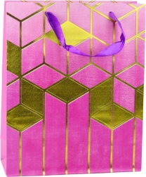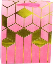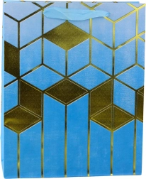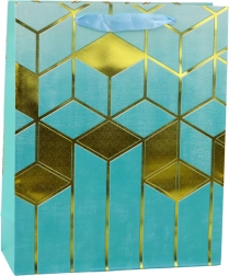 Ce sac cadeau élégant allie design moderne et praticité. Il est orné de motifs géométriques dorés marqués et de couleurs intenses, en faisant un emballage représentatif pour tout cadeau. Le carton décoratif robuste et les anses en corde résistantes assurent un transport confortable et sécurisé.