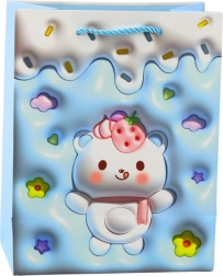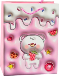 Adorable sac cadeau en papier avec motif d’ourson aux couleurs pastel, idéal pour emballer des cadeaux pour enfants et proches. Il se distingue par un carton décoratif de qualité, des motifs ludiques de fruits, d’étoiles et de « glaçage » et des anses en cordon robustes pour un transport en toute sécurité. Grâce à ses dimensions 23 × 18 × 10,5 cm, il convient aux jouets, douceurs et petits présents.