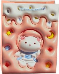 Ce sac cadeau en carton décoratif séduit par une palette pastel en rose, bleu, orange et violet. Le mignon ourson avec étoiles et détails fruités crée un effet 3D donnant l’impression qu’il sort du sac. Le look élégant est complété par des anses en cordon assorties pour un port confortable et sûr.
