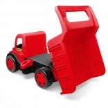 Grand camion rouge avec benne basculante de 55 cm offrant des heures de jeu à la maison comme en extérieur. Il possède une benne ouvrante avec poignée pratique, deux attaches à l’avant et à l’arrière pour le remorquage et l’attelage d’une remorque, ainsi qu’une capacité de charge exceptionnelle jusqu’à 150 kg. Sa conception robuste en plastique de qualité favorise le développement de la motricité et de l’imagination des enfants.