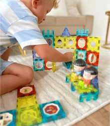 Le set comprend des formes variées pour construire des tours, des maisons et des châteaux, 2 figurines pour le jeu narratif, des autocollants pour peaufiner les détails et un guide avec des inspirations. L’emballage pratique avec poignée se transporte facilement et constitue un excellent cadeau.